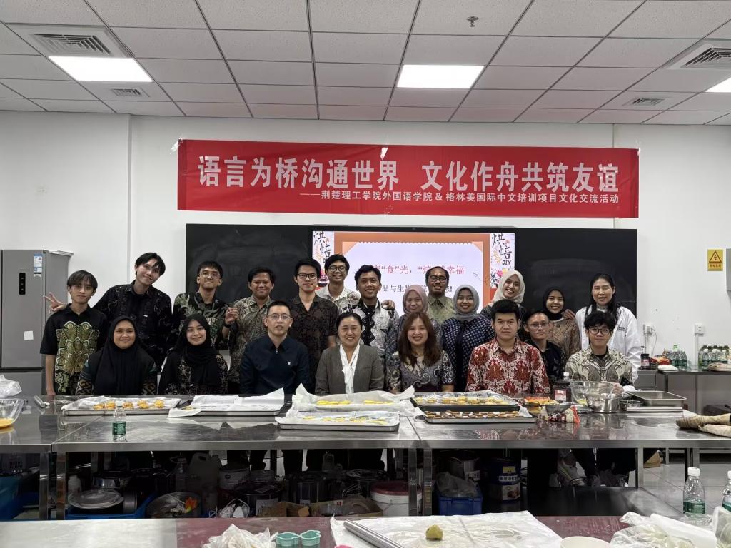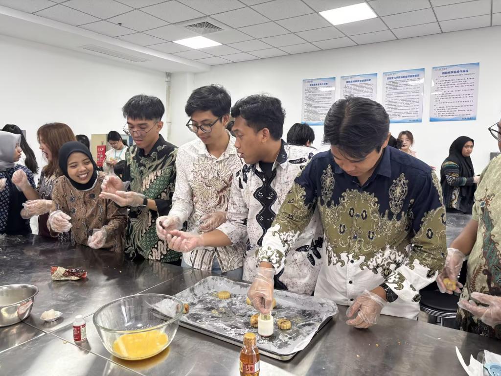 与此同时,在食品与生物工程学院,印尼学生们在老师的悉心指导下,亲手制作象征团圆的中秋月饼,从和面、包馅到压模,每一个步骤都充满了新奇与乐趣。