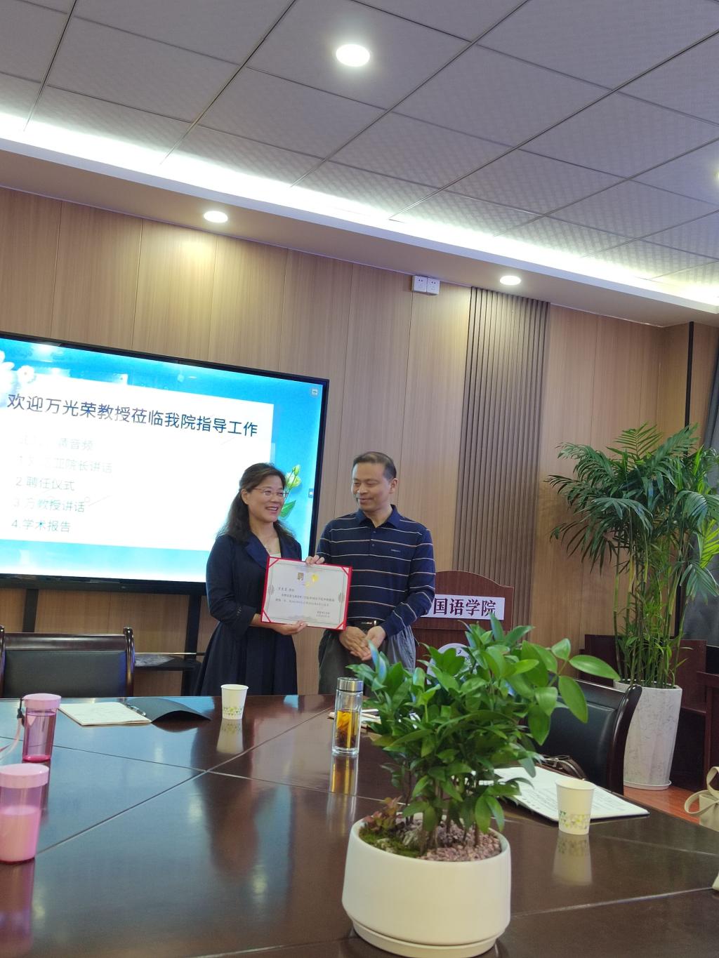会上,刘诺亚为万光荣教授颁发了聘书。万教授正式成为我院外聘教授,为期三年。万光荣成为我院历史上首个外聘教授。