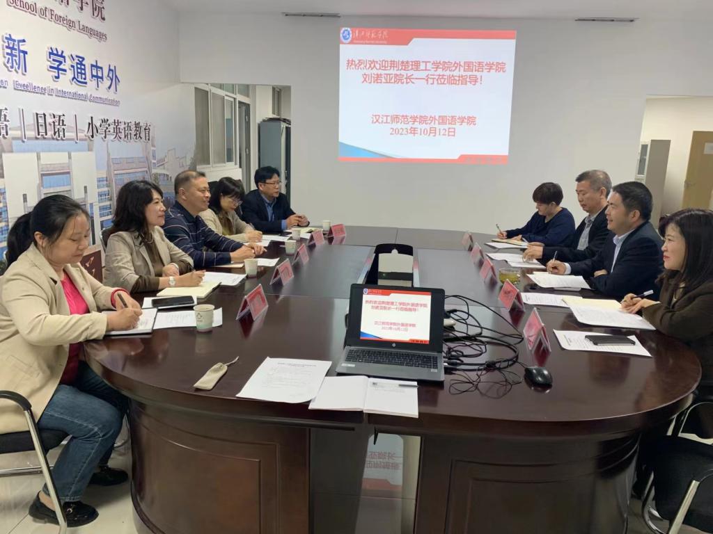 祝院长介绍了汉师外院本科专业、师资力量、产学研合作教育、第一、第二课堂延展的基本情况。冯晓华副院长分享了汉师外院在专业建设、人才培养方案制定、课程建设、教师教育类课程教学等工作中的亮点和特色。齐雁飞副院长就大学英语教学改革及考研辅导情况作了详细介绍。随后,双方就一些专业办学的难点痛点进行了深入讨论和交流。