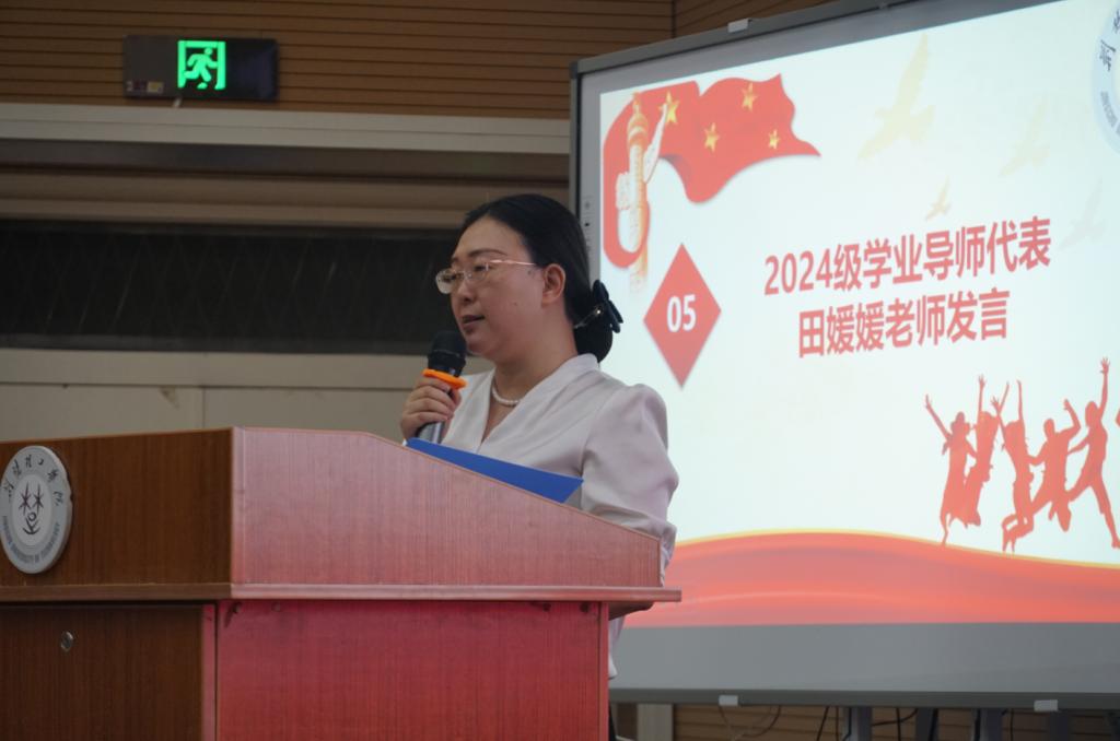 学业导师代表田媛媛在发言中表示希望24级的小萌新们在大学四年里,孜孜不倦,精进专业知识,积极参加社团和竞赛,培养独立思辩思维,考取相关证书,厚积薄发。
