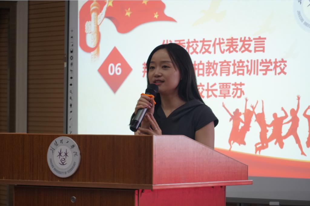 优秀校友代表覃苏,现任荆门市正柏教育培训学校副校长,从以终为始、成长性思维、核心竞争力三个方面鼓励学弟学妹们要积极进取,端正学习态度,努力学好专业知识,成就未来更好的自己。