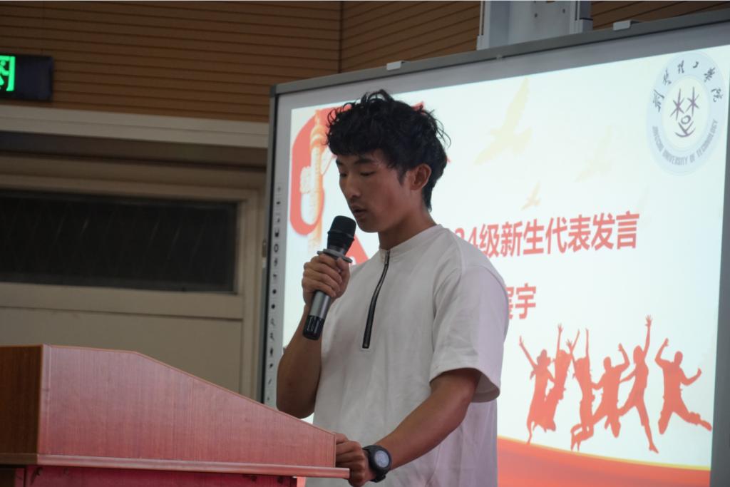 新生代表刘宸宇首先表达了对大学四年生活的憧憬,并表态要努力学习,团结同学,积极参加社会实践活动,在大学四年能学有所得、不虚此行,并号召全体新生争做有理想、敢担当、能吃苦、肯奋斗的新时代好青年。