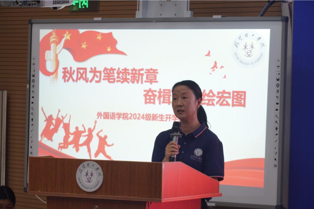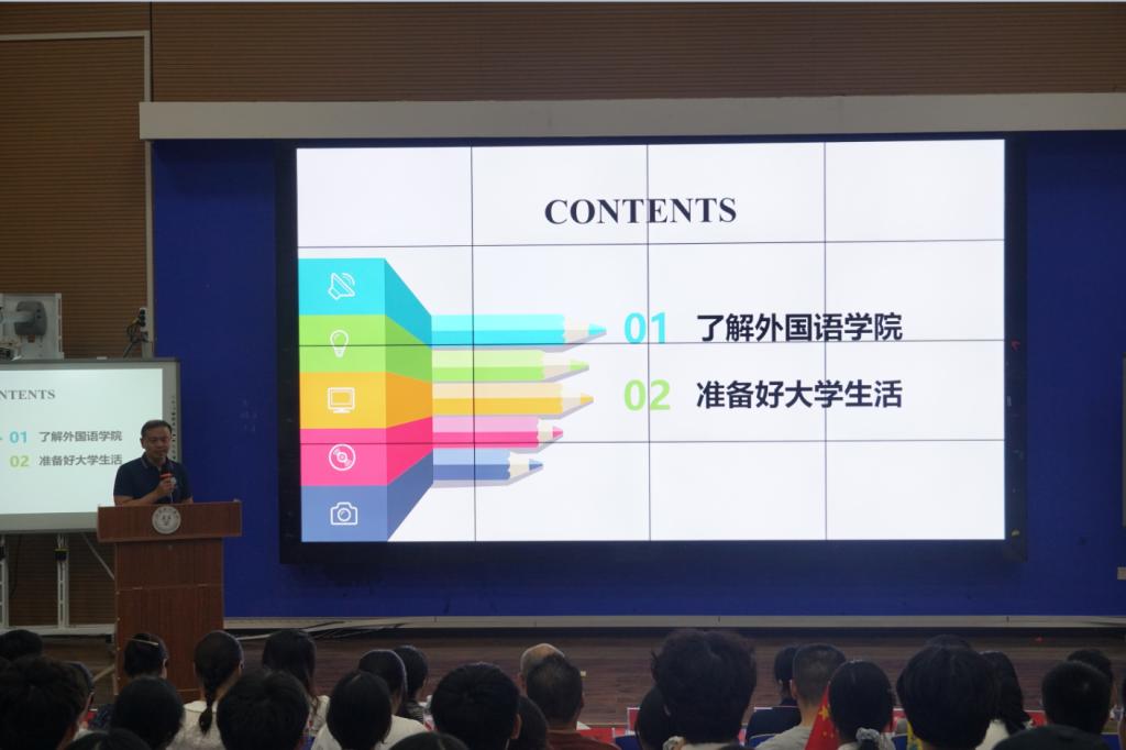 大会在威严的国歌中拉开帷幕,议程首先由院长刘诺亚发表热情洋溢的致辞,他代表学院向2024级新生表示热烈欢迎,通过阐释“以德修文,学通中外”的院训鼓励新生志存高远、脚踏实地,夯实专业基础知识。刘诺亚分享了英语学习的方法、思维和习惯,告诫新生在学习的道路上不要贪图安逸,碰到困难不轻言放弃,最后他祝新同学在大学四年“有所忙、有所爱、有所获”,度过健康,快乐,充实的大学时光。