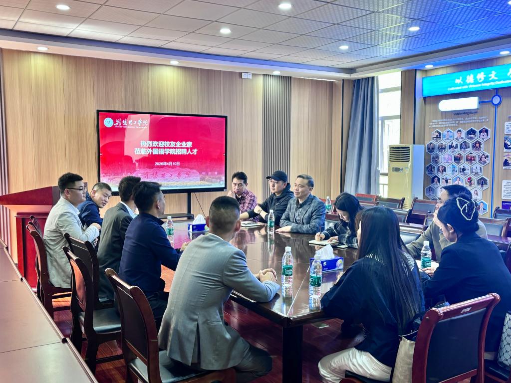 4月10日上午,在tyc122cc太阳成集团2026届毕业生春季校园双选会(校友企业)专场招聘活动举办之际,太阳成集团122ccvip迎来了来自广东、西安、襄阳等地的校友企业家和教育机构负责人,他们分别代表西安杰灿电子科技,广东德帕化学,彩佳包装科技,中信宏图教育等企业来我院招聘人才,共话校企合作。学院院长刘诺亚热情接待来访校友企业家,学院党委副书记王玥、科研工作负责人田琦及商务英语系主任、专业负责人张关俊等参加座谈。