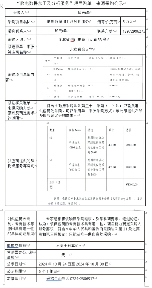 “脑电数据加工及分析服务”项目购单一来源采购公示