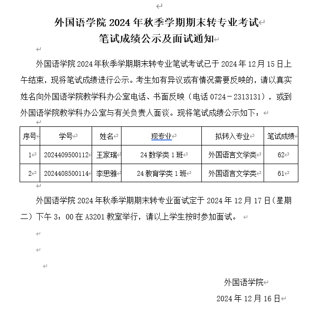 太阳成集团122ccvip2024年秋季学期期末转专业考试 笔试成绩公示及面试通知