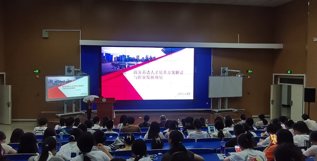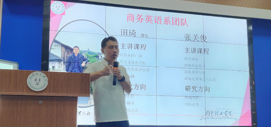 商务英语系主任张关俊先介绍了商务英语系全体老师、他们的研究方向以及他们所带课程,让学生对自己的专业老师有了更深的了解和印象;接着以吕盼、朱晓菲、王陈、朱雅伶、周雨田、伍佩敬、喻洁心、黄慧林和陈厚龙等九位往届毕业生的职业发展轨迹和现状展示了商务英语专业的职业发展特征:市场需求广泛、待遇优厚、晋升空间广阔和职业路径多元;希望学生能在低年级时博览群书、开拓视野、勇于尝试,高年级时聚焦目标、积累经验、调整心理状态,努力培养英语语言、商务、数据分析、国际视野、跨文化和终生学习等方面的能力。