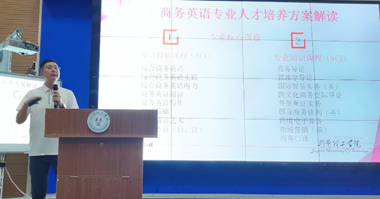 商务英语专业负责人田琦从本专业的人才培养中长期目标、毕业要求、核心能力、课程体系以及核心课程等方面为与会师生详细解读了商务英语专业人才培养方案的设计理念、执行以及对本专业学生的要求。