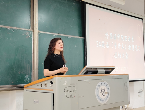 大会由英语系主任何琳玲主持。在正式进入会议议程之前,现场播放了一段精心制作的视频短片,回顾了本次教育见习的精彩瞬间。随后,专业负责人罗倩对本次教育见习的整体情况进行了全面总结。她指出,本次见习是英语(专升本)人才培养方案的重要环节,同学们通过在多所中小学的实践,获得了宝贵的教师专业实践经验,为未来的教育实习和职业发展奠定了坚实基础。罗倩老师还提到,见习期间同学们严格遵守纪律,展现了良好的职业形象,并在师德体验、教学见习、班级管理见习和教研见习四大板块中收获颇丰,为下学期的教育实习打下了坚实的基础。