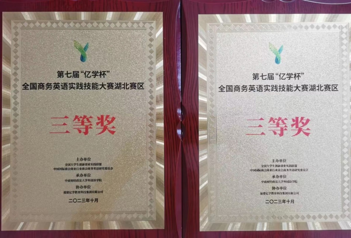 经过6个月的赛前训练和准备、线下答题和现场演讲比赛的激烈角逐,由我院王娇艳和罗颖两位老师指导和带队,21级商务英语系的两支参赛队伍最终凭借精彩的表现获得湖北省赛区三等奖的成绩。