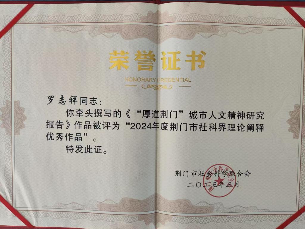 我院罗志祥博士撰写的“厚道荆门城市人文精神研究报告”获的荆门市委书记批示。该成果获得由荆门市社会科学联合会组织评比的“2024年度荆门市社科界理论阐释优秀作品”。