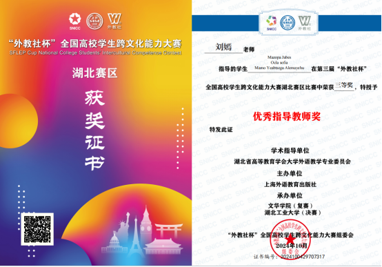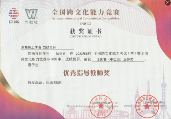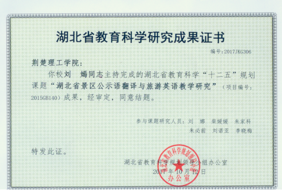 工作以来先后发表学术论文20余篇。积极承担省级、校级科研任务。2015年主持省级科研项目《湖北省景区公示语翻译与旅游英语教学研究》并结题;2023年入选首批荆门市优秀社科人才队伍;2023年指导学生陆钊玄参加全国跨文化能力竞赛,获得全国赛(中级组)三等奖;2024年指导国际学生参加“外教社”杯全国高校学生跨文化能力大赛,获湖北赛区三等奖。